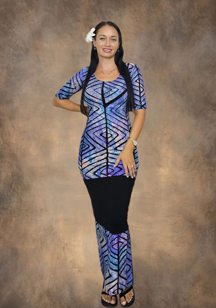 PULETASI – A traditional yet elegant Samoan piece worn for a variety of formal occasions by Women. It is a two-piece outfit with a skirt and a top, either with both pieces in the same fabric or as a plain skirt and patterned top. Here is our Unique Tahitian version of this beautiful attire.